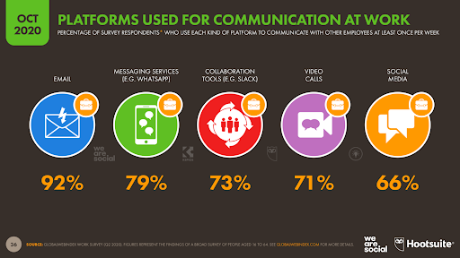 Apesar do e-mail ainda ser a plataforma de comunicação mais usada no trabalho, há um crescimento significativo no uso de redes sociais para esta finalidade, principalmente em colaboradores na faixa etária entre 16 e 24 anos.