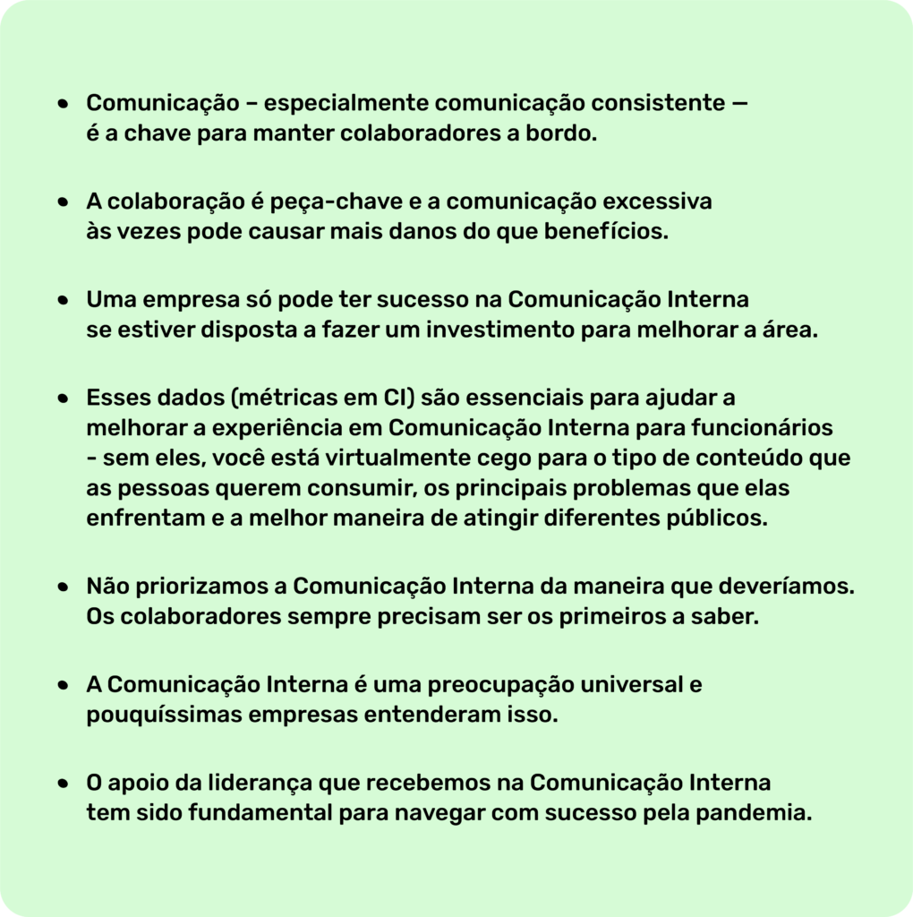 Os organizadores do estudo também perguntaram para mais de 300 comunicadores internos qual foi o maior aprendizado nos últimos 12 meses. Confira abaixo algumas das respostas: