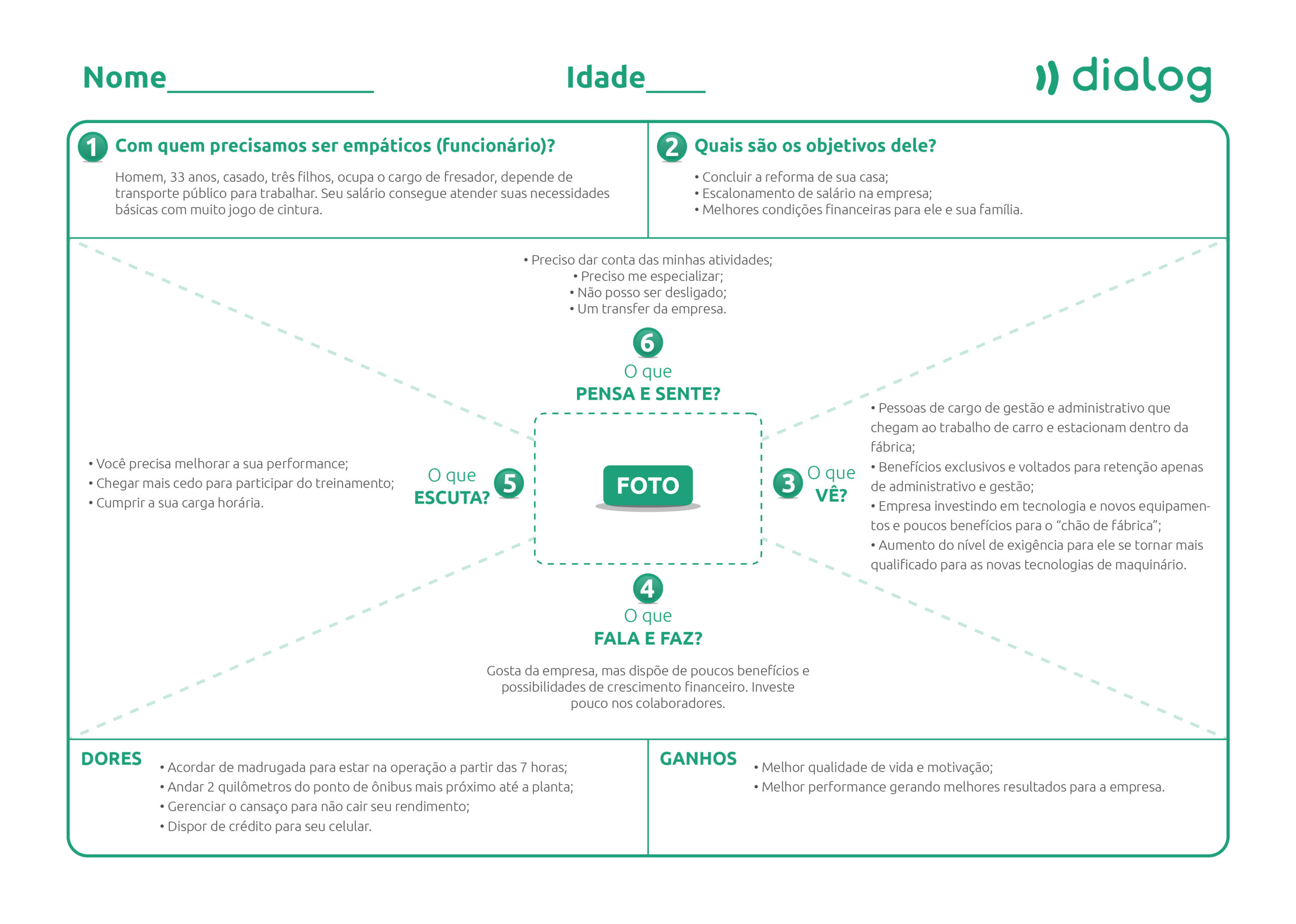 Agora pegando aquele exemplo lá de cima, o colaborador do chão de fábrica, considerando as análises descritas acima, montamos o mapa da empatia: